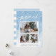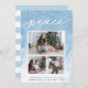 Compartilhe cartões de natal com esses Cartões de foto de Natal chic com três de suas fotos favoritas (1 paisagem, 2 quadrados) organizadas em um layout de colagem retangular em um fundo azul-claro de lavagem com aquarela acentuado com queda de neve. "Paz" aparece no topo na elegante tipografia escrita escrita com letra de mão. Personalize com seu cartões de natal personalizado, nome(s) e ano na parte inferior. Cartões invertidos a um padrão de faixa em azul pastel e branco.