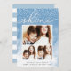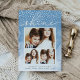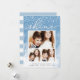 Compartilhe cartões de natal com esses cartões com fotos chic Hanukkah apresentando três de suas fotos favoritas (1 paisagem, 2 quadrados) organizadas em um layout de colagem retangular em um fundo azul-claro de lavagem com aquarela acentuado com queda de neve. "Brilho" aparece no topo na elegante tipografia de script escrita à mão. Personalize com sua saudação personalizada de Chanucá, seu(s) nome(s) e o ano na base. Cartões invertidos a um padrão de faixa em azul pastel e branco.