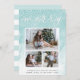 Compartilhe cartões de natal com esses Cartões de foto de Natal chic com três de suas fotos favoritas (1 paisagem, 2 quadrados) organizadas em um layout de colagem retangular em um fundo aquoso pálido de lavagem a aquarela, acentuado com queda de neve. A "Feliz" aparece no topo na elegante tipografia de script escrita à mão. Personalize com seu cartões de natal personalizado, nome(s) e ano na parte inferior. Cartões que se estendem por estrias em turquesa pastel e branco.