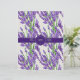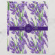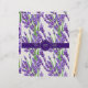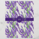 Um invólucro para sabão feito à mão, com flores lavandas e folhas verdes sobre fundo branco