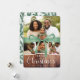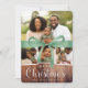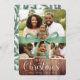 O cartão com fotos festivo apresenta quatro das suas imagens favoritas adornadas com uma ilustração do arco de fita de cor d'água verde. "Feliz Natal" aparece debaixo de letras brancas sobre um fundo rústico de madeira. Personalize com seus nomes e o ano.