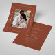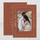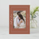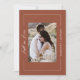 Capture a essência do romance do outono com este maravilhoso convite para o casamento, projetado para deixar uma impressão duradoura. O lado frontal apresenta uma foto personalizada de casal em um tamanho médio com orientação vertical, fazer-a como ponto focal do design. A frase "Cair no Amor" é lindamente escrita em elegante caligrafia branca, colocada verticalmente no lado esquerdo médio, acrescentando um toque poético e romântico. Os nomes dos casais são mostrados em tipografia sans-serif branca e limpa no lado médio direito, criando um olhar moderno e sofisticado. Um rico fundo de terracota, enquadrado por uma delicada linha de fronteira branca, reforça a elegância e o calor gerais do convite. O verso complementa a frente com detalhes personalizados do casamento apresentados em uma mistura harmoniosa de serifa branca, sans-serif e tipografia da serifa itálica. O fundo coeso de terracota gravatas todo o design, fazer este convite uma escolha perfeita para casais que procuram refletir a beleza e o calor do seu casamento outono. Mais do que um pedaço de papelaria, este convite é um guardião que lindamente encapsula sua história de amor.