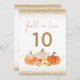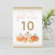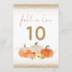 Cai no Amor Pumpkins Dourado Número da Mesa de Casamento Glitter. O outono apresenta-se com Pumpkins laranja e creme e florais com um toque de falso brilho e bordas de dourado com brilho no topo e no fundo para um pouco de brilho. O número da tabela está em ouro. A queda no amor está no topo de um roteiro elegante. O mesmo design está do outro lado.