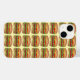 A capa de telefone apresenta uma ilustração original de um hambúrguer tocado com queijo, tomate e alface em um pão.