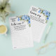 Flores Azuis Quem sou eu? Jogo de versão em inglês e espanhol do chá de panela incluído (frente e verso). Mudar a redação para o design para as versões em inglês e espanhol. Para personalização adicional (alterar outro texto, cor da fonte, estilo da fonte ), clique em personalizar, role para baixo e clique no link "clique para personalizar mais". Como jogar: os convidados anotam uma memória pessoal que têm com a futura noiva. A Noiva lerá cada carta e se ela não se lembrar do convidado; aquele convidado ganha um prêmio!