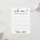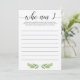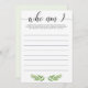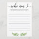 Você está procurando um jogo de quebra-gelo para jogar no seu chá de fraldas? Jogue Quem sou eu com esses cartões de jogo verde com folhas de aquarela. É a adição perfeita ao seu jardim ou ao seu chá de fraldas botânico e é certo que será um sucesso na sua festa! Deixem seus convidados chás de fraldas anotar uma memória pessoal que eles têm com as mamães a serem. Quando todos tiverem listado uma memória, leia-a em voz alta e deixe a mãe adivinhar com quem ela teve a memória. Se ela não se lembrar, o convidado vai ganhar!