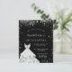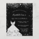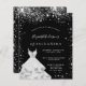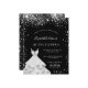 Um convite moderno, na moda e glamouroso para uma Quinceañera, festa de aniversário 15. Um fundo preto chic com pó cinza e um vestido. O nome é escrito com um moderno estilo escrito à mão. Personalize e adicione os detalhes da sua festa. 1 folha = 1 convite impresso de borda a borda.