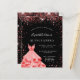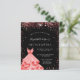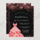 Um convite moderno, na moda e glamouroso para uma Quinceañera, festa de aniversário 15. Um fundo preto chic com poeira cintilante vermelha e um vestido. O nome é escrito com um moderno estilo escrito à mão. Personalize e adicione os detalhes da sua festa.