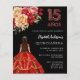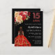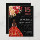 Um convite moderno, na moda e glamouroso para uma Quinceañera, festa de aniversário 15. Um fundo preto, uma garota vestindo um vestido vermelho e dourado e rosas vermelhos, cor-de-rosa e ouro, florais. O nome é escrito com um moderno estilo escrito à mão. Personalize e adicione os detalhes da sua festa. 1 folha = 1 convite impresso de borda a borda.