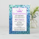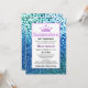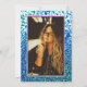 Um chic moderno, bonito e elegante brilho azul convida com luzes bokeh com uma foto no verso. Convite para comemoração de Quinceañera com um fundo branco e uma espátula violeta brilhante. Perfeito para uma princesa quinceañera, perfeito para ela, a modista que ama o padrão e o brilho modernos.