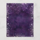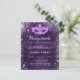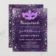 Para um Mascarada elegante, Quinceañera, 15 aniversário. Um padrão floral roxo profundo como fundo. Decorado com pó falso prateado brilhante e uma máscara de mascarada. Personalize e adicione um nome, idade e detalhes da festa. O nome é escrito com um script de estilo manuscrito
