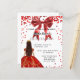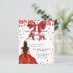 Um convite moderno, na moda e glamouroso para uma Quinceañera, festa de aniversário 15. Um fundo branco com confete, um vestido vermelho e um arco vermelho. O nome é escrito com um moderno estilo escrito à mão. Personalize e adicione os detalhes da sua festa. 1 folha = 1 convite impresso de borda a borda.