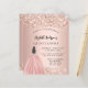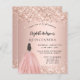 Um convite moderno, na moda e glamouroso para uma Quinceañera, festa de aniversário 15. Um fundo rosa de ouro com poeira falsa de ouro, uma garota vestindo um vestido de bola. O nome é escrito com um moderno estilo escrito à mão. Personalize e adicione os detalhes da sua festa. 1 folha = 1 convite impresso de borda a borda.