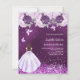 Para uma Quinceañera elegante. Um fundo púrpura incolor. Decorado com confete, borboletas, rosas e uma garota de vestido. Personalize e adicione um nome, idade/texto e detalhes da parte. O nome é escrito com um script de estilo manuscrito. 1 folha = 1 convite impresso de borda a borda.