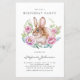 This charming birthday invitation features a hand-painted watercolor rabbit nestled inside a delicate pink and lilac flower wreath. The soft pastel colors and whimsical design make it the perfect invite for a spring or garden-themed birthday party. It adds a touch of sweetness to any celebration, especially for kids or animal lovers. Customize this adorable invite to suit your event and make it even more special for your guests.