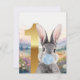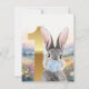 Coelho cinza com orelhas cor-de-rosa soprando uma chiclete azul num campo de flores silvestres. Primeiro aniversário com o ouro número um