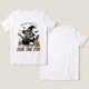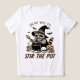 Um guaxinim "sinistro" sorri enquanto ele atira um caldeirão de bruxa acompanhado pelo ditado engraçado "A caminho de agitar o Pote." Este design preto, branco e laranja dá uma pitada de escuridão apesar do texto engraçado. Vá um pouco "selvagem" nesta temporada de Halloween e continue em tendência com este design divertido.