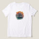 A design da t-shirt "Retro Radiance" apresenta uma mistura vibrante e nostálgica de estética dos anos 80. No seu centro, uma explosão solar neon brilhante irradia tons suaves de rosa, laranja e roxo.