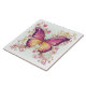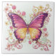 This vibrant ceramic tile features a stunning jewel-toned butterfly surrounded by swirling florals and delicate blossoms. Painted in rich shades of magenta, fuchsia, gold, and plum, the intricate detailing gives the artwork a luminous, almost stained-glass quality. Soft pastel greens in the background add a gentle glow that enhances the butterfly’s vivid wings and elegant curved accents.