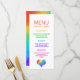 Cardápio de casamento divertido para um casamento de gay ou lésbicas, com um coração de arco-íris e fontes em cores compatíveis.