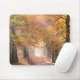 Mousepad com raios de luz criou por raios de sol através do folhagem de outono das árvores ao longo de um trajeto através de uma floresta na névoa da manhã no outono.
