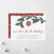 Convide amigos para celebrar em sua nova casa com nossos convites de festa de casa nova de Natal festivos e modernos. O design apresenta um ramo de pinheiro verde caçador adornado com um enfeite de bola vermelho e verde, e "nova casa para as festas" em letras de caligrafia vermelha. Adicione os detalhes da sua festa de casa nova em letras verde caçador.