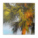 Num clima tropical, a fotografia original de MaeFlowers nesse pequeno Azulejo cerâmico mostra o topo de uma palmeira com seus galhos e tronco banhados no brilho quente do sol da tarde. Os ramos longos e pontiagudos no fundo são verdes escuros, se espalhando como ventiladores. Os ramos em primeiro plano são um verde-amarelo-claro, curvando para fora à medida que pegam a luz solar. O tronco da árvore, normalmente de cor marrom médio, parece quase laranja no final da tarde. Um céu azul aqua pálido dispara os tons ricos da terra da palmeira, e completa a cena tropical.