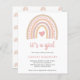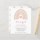 Bonito Chá de fraldas do orçamento Convite com um arco-íris em cores pastel mutadas junto com um coração rosa no meio. O cabeçalho diz, "É uma Rapariga" no guião. A parte de trás tem um padrão com o mesmo arco-íris que a frente. Estes convites baratos para chuveiros de bebês são impressos em folhas de papel para uma opção econômica.
