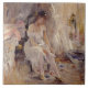 Este design apresenta uma pintura do artista impressionista francês Berthe Morisot (1841-1895). Mostra uma garota num cenário elegante e opulente, talvez um palácio aristocrático ou uma casa luxuosa. Ela está sentada em uma grande cadeira e está vestindo um vestido branco. Ela tem calçados de ouro com saltos altos e está puxando suas meias.