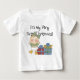 Uma menina adorável com presentes de Natal e texto que diz "É o meu primeiro Natal" nas primeiras T-shirts de Natal, carroças, canecas, cartões, autocolantes, sacos de totas de férias, ímãs e outros equipamentos de Natal que você pode facilmente personalizar antes de pedir com o nome da sua bebê!
