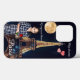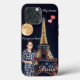 Rapariga Romântica Torre Eiffel Dream iPhone 13 Pro Capas é a torre mais bonita de Paris e a linda garota segurando uma bela rosa na mão mostra um sonho romântico forte com palavras românticas e a torre é muito bonita com luzes. Olhem para o fundo preto e para os corações.