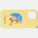 A raposa adormecida e bonita, com orelhas grandes e cauda espinhenta, está bocejando sob um guarda-chuva azul.