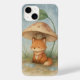 Uma ilustração aquosa de uma pequena raposa que se abriga sob um cogumelo gigante durante uma chuva suave. Com tons suaves e terríveis e uma atmosfera sonhadora, esta peça captura a magia silenciosa de um dia chuvoso na floresta.