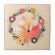 Uma raposa-cama é enrolada dentro de uma bonito coroa floral no estilo do bolho na imagem de aquarela neste azulejo. As cores na imagem são laranja, ouro, creme, violeta roxa, rosa, bronzeada e verde. A imagem é colocada sobre um fundo claro ou bege.