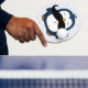 Um pinguim giro azul giro com um enorme bigode preto com fundo azul.