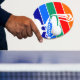 Ping Pong Paddle com uma design com a bandeira da Rua. Petersburgo, Flórida. Uma bandeira com faixas laranja, vermelha, verde, azul e azul marinho com um símbolo pelicano branco