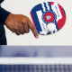 Ping pong paddle com pavilhão da cidade de Jefferson, Missouri; bandeira vermelha, azul e branca