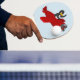 Ping Pong /addle com design com uma ilustração de um pinguim que voa num plano vermelho; ilustrada por Radka Kavalcova/MaxiHarmony