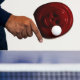 Ping Pong Paddle com o crânio embebido num humor de cor sanguínea.