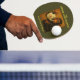 O famoso e imaginário bar Chimp e Teapot em Wick, na Escócia. Um chimpanzé segurando um bule de chá com um padrão floral como se estivesse prestes a beber do bico. Na parte superior, lê-se "O CHIMP E O TEAPOT" Personalize adicionando seu próprio texto adicional.