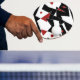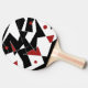 Várias formas geométricas brancas e vermelhas estão espalhadas sobre um fundo preto, criando um forte contraste. Algumas formas são interconectadas com linhas brancas finas, e pontos vermelhos adicionam um pop de cor à composição.