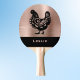 This ping pong paddle has a vintage farmhouse chicken motif that's all gussied up in a black filagree with fancy cut-out swirls. It's set against a copper like rose gold background -- it isn't actually metal but just has faux metallic effects in a rose gold color. Your monogram name appears in a coordinating typeface on a black color block below. This design is similar to folk art or country farmhouse retro artwork and knickknacks and adds some country style to your game. These paddles would be great for a rural community center, country cabin, vacation rental house, or gift.