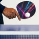 Linhas magenta, amarelas, laranja e azuis, como luzes laser em um fundo preto, criam uma pega de pingue-pongue que chama atenção. Muito alta tecnologia e design moderna!