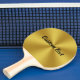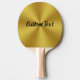 Esta pá de pingue-pongue dourada tem texto em um script preto. O texto pode ser editado ou apagado. O olhar de ouro não é feito de folha.
