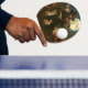 Uma cena assustadora com uma lua de cheio brilhando num campo de milho, Uma espantalho assustadora está tocando violino enquanto alguns animais olham, pequenas criaturas e uma coruja fazem parte dessa estranha foto do Dia das Bruxas.