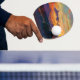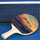 Um design de arte de um belo pôr do sol também mostrando rochas, praia e um homem pescando.