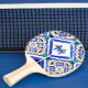 Um belo design de colheita do padrão azulejo espanhol e português Azulejo em azul marinho, branco e traços de laranja verde e claro. O design pode ser personalizado para o seu monograma correspondente. Um belo gosto do Mediterrâneo perfeito para a decoração natal Summer. O perfeito design de pá de pingue-pongue geométrico geométrico, de mesa, ideal para qualquer ocasião.