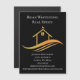 Este imã de cartão da empresa imobiliária é feito sob a tipografia branca com o nome da sua empresa real. Esses cartões magnéticos são perfeitos para distribuir enquanto marketing em um evento de promocional. Eles apresentam uma bonito casa com uma faixa do tempo em cima e curvas elegantes embaixo de ouro sobre fundo preto.
