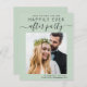 Na moda, um elopeio verde sábio/anúncio de casamento privado salve a data que mostra sua foto do dia de casamento e "Salve a data para nossa festa feliz" na tipografia moderna e um roteiro de chic com balanços. Sob sua foto, adicione seus nomes e data de recepção e local; no verso, personalize seu anúncio de casamento, insira seu endereço de site de casamento para criar um código QR para seus convidados pesquisar mais informações e adicionar seus nomes em um script semelhante a assinatura.