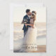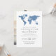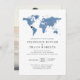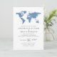Convite com tema de viagem de mapa mundi para uma recepção em casa após um casamento em destino distante ou fuga romântica com um mapa mundi azul poeirento e fontes clássicas e uma foto de casamento no verso. Se você está tendo uma recepção em casa após um pequeno casamento no exterior ou um casamento surpresa na praia e sua família deseja celebrar na sua cidade natal, é uma ótima oportunidade para se divertir com convites ou ter uma recepção com tema de viagem para o casal que viaja com frequência e se conheceu enquanto viajava. Adicione um cartão de RSVP com tema de viagem para completar o conjunto, confira a Paper Grape Destinations na Loja de Designers Zazzle.